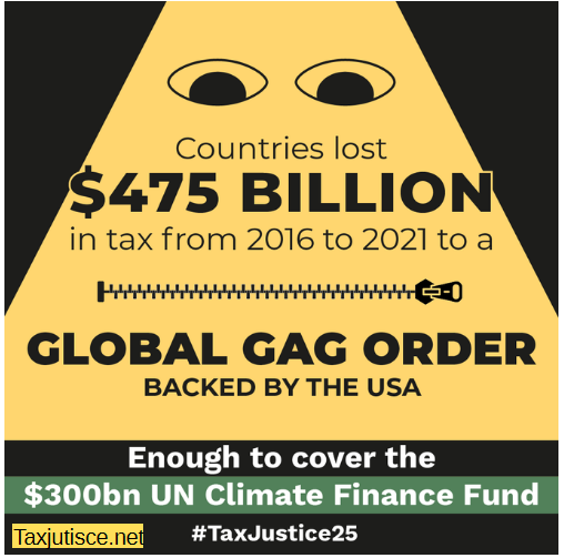 Dans son rapport « L’état de la justice fiscale en 2025 », Tax Justice Network révèle ainsi qu’une ordonnance de bâillonnement soutenue par les États-Unis qui empêche les gouvernements de révéler les noms des multinationales ayant transféré des milliards vers des paradis fiscaux a fait perdre aux pays plus de 475 milliards de dollars américains en impôts sur les sociétés entre 2016 et 2021. Les plus grands perdants sont les États-Unis eux-mêmes, qui se privent de 158,5 milliards de dollars américains de recettes, et la France avec une perte estimée à 32,3 milliards de dollars américains, soit 27,3 milliards d’euros en matière d’impôt sur les sociétés (IS).