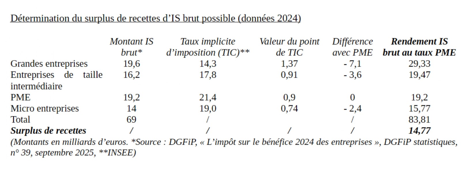En 2019, il avait été ainsi démontré que le taux d’imposition des sociétés (IS) des PME s’élevait à 23,7 % de leurs bénéfices quand celui des grandes entreprises n’était que de 17,8 %*. En 2023, le Conseil des prélèvements obligatoires avaient également montré que les écarts d’imposition entre entreprises perduraient **, ce qu’un rapport d’information de l’Assemblée nationale confirmait cette année-là***. Les derniers travaux de l’INSEE confirment ce diagnostic.